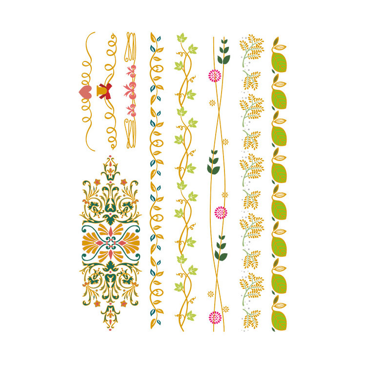 Deze 3-dagen tattoo is speciaal ontworpen om te dragen als tijdelijke sieraden of versiering langs je huid. De lange, smalle designs doen het fantastisch als armband of enkelband, maar staan ook prachtig op je bovenarm, rug of rond je sleutelbeen. De centrale ornamenten zijn perfect als eyecatcher op bijvoorbeeld de buik, het borstbeen of de onderrug.