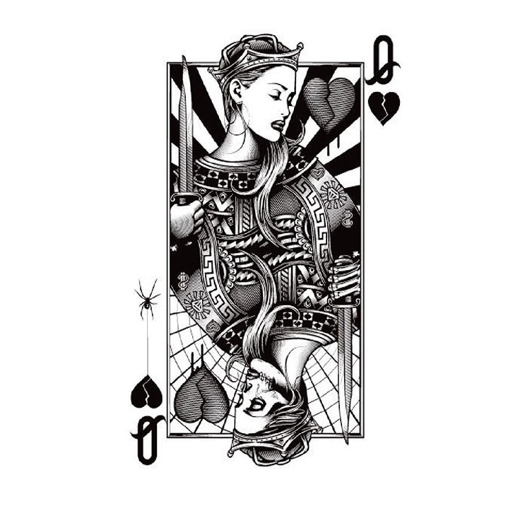 Broken Queen is een tijdelijke tattoo van 11,4 x 21 cm met een opvallend zwart-wit ontwerp dat balanceert tussen kunst en rebellie. Deze alternatieve versie van de Queen of Hearts draagt geen glimlach, maar een zwaard. Haar hart is gebroken, haar blik is scherp en haar uitstraling is krachtig en onafhankelijk.