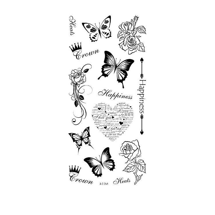 Butterfly Crown Love is een veelzijdige en elegante set van zwarte tijdelijke tattoos met een sierlijk en romantisch karakter. Het vel (9 x 19 cm) bestaat uit meerdere losse tattoos die samen een speelse compositie vormen: gracieuze vlinders, klassieke rozen, stijlvolle kroontjes en liefdevolle woorden zoals Happiness, Crown, Heals en Love you. De centrale hartvorm met tekst trekt extra aandacht en maakt het ontwerp compleet.