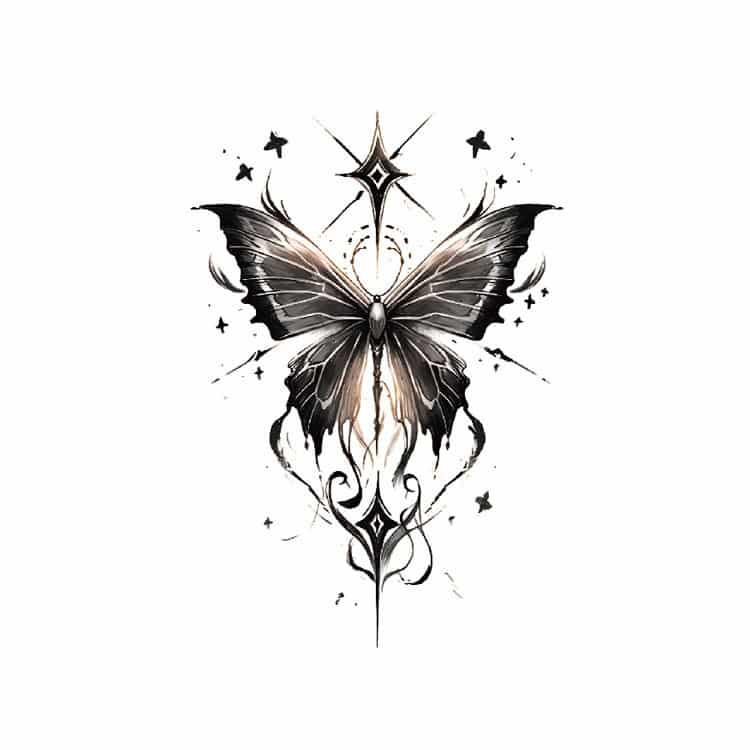 Celestial Butterfly is een betoverende 3 dagen tattoo van een sierlijke vlinder, omlijst door fonkelende sterren en elegante lijnen. Deze mystieke stijl combineert kracht en schoonheid in één opvallend ontwerp. Het tattoo vel is 12 x 19 cm, met een prachtig gedetailleerde tattoo die iets kleiner is dan het vel zelf.