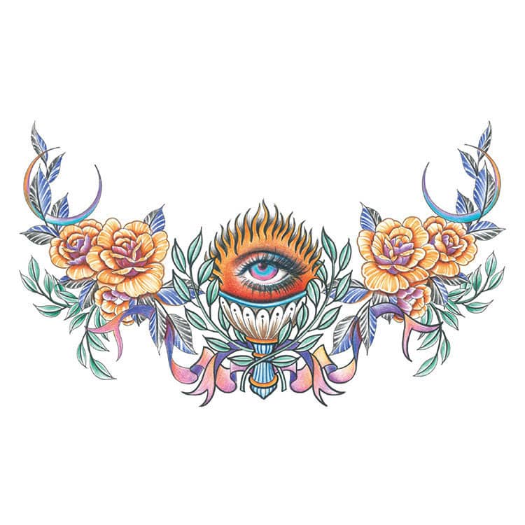 Eye of Ember Bloom is een mysterieuze tijdelijke tattoo van 32 x 19 cm, ontworpen voor vrouwen. Een brandend oog siert het midden, omlijst door vurige vlammen, goudgele rozen en maansikkels. Deze tattoo blijft ongeveer 3 dagen zitten en is perfect voor borst of rug. Voor wie durft te stralen én op te vallen.