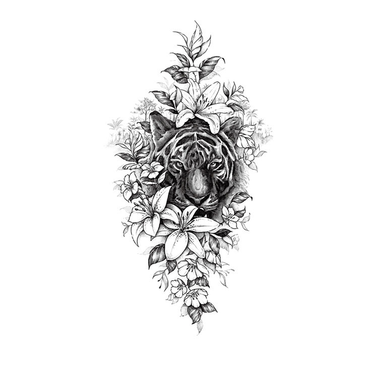 De tijger staat al eeuwenlang symbool voor moed, doorzettingsvermogen en innerlijke kracht. In dit ontwerp wordt dat krachtige symbool subtiel in balans gebracht door bloemen die onder andere puurheid, groei en zachtheid representeren. Hierdoor ontstaat er een prachtig contrast dat direct in het oog springt. Dankzij het realistische zwart-grijs effect en de schaduwaccenten lijkt deze tijdelijke tattoo haast een echte tattoo – zonder de permanente keuze.