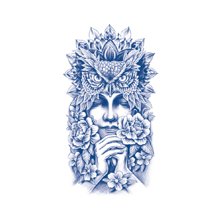 Forest Wisdom is een adembenemende tijdelijke tattoo met een diepe symbolische laag. In dit kunstwerk vloeien de elementen van natuur, mystiek en vrouwelijke kracht op indrukwekkende wijze samen. Het middelpunt wordt gevormd door een serene vrouwenfiguur met gesloten ogen – een symbool van innerlijke rust en verbinding met de natuur. Haar gezicht is gedeeltelijk verborgen achter een majestueus uilenmasker, gemaakt van bladeren en bloembladeren. De uil staat al eeuwenlang symbool voor wijsheid, intuïtie en het onzichtbare weten.