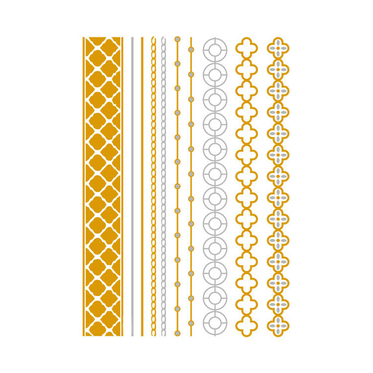 De gouden en zilveren tinten zorgen voor een luxueuze metallic glans, terwijl de geometrische patronen – zoals kettinglijnen, cirkels en klassieke ornamenten – voor een moderne en tijdloze uitstraling zorgen. Of je nu naar een beach party gaat, een zomerse bruiloft bijwoont of gewoon een fashionable statement wilt maken: deze tattoo’s maken je outfit helemaal af.