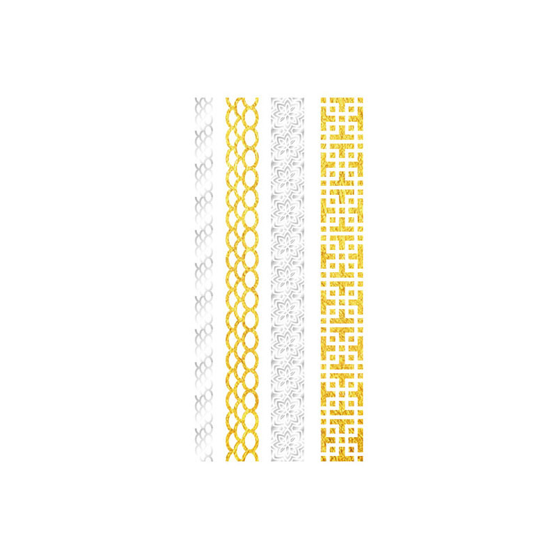 De combinatie van rechte lijnen, krullende details en bloemmotieven geeft deze tattoo een balans tussen modern en klassiek. De gouden patronen zorgen voor een warme glans, terwijl de zilveren accenten het ontwerp fris en elegant houden. Draag ze op je onderarm, enkel, sleutelbeen of als subtiele versiering bij een open rug of halslijn. Je kunt ze ook los knippen en als ring- of armbanddetail gebruiken.