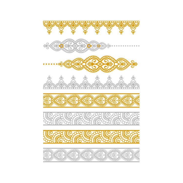 Golden Mirage is een luxe metallic tattoo vel in goud en zilver, vol elegante patronen en oosterse details. Perfect als armband, enkelband of halsversiering. Deze 3-dagen tattoo geeft je een glamoureuze look zonder gedoe. Waterbestendig, huidvriendelijk en makkelijk aan te brengen. Voor iedere gelegenheid waar je wilt stralen met subtiele klasse.