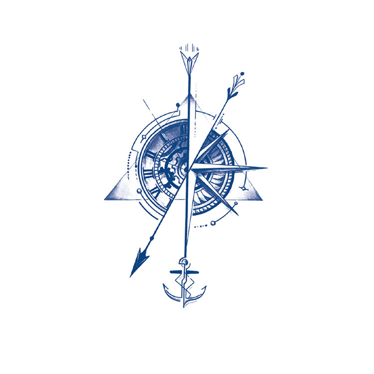 Het leven kent vele wegen, en deze tattoo herinnert je eraan om je koers te blijven volgen – hoe onstuimig de reis ook is. Deze tijdelijke tattoo (blijft ongeveer twee weken zitten) is met zorg ontworpen en laat een elegant samenspel zien van symbolen met diepe betekenis: het kompas staat voor richting, de klok voor de waarde van tijd, de pijl voor focus en vooruitgang, en het anker voor standvastigheid.