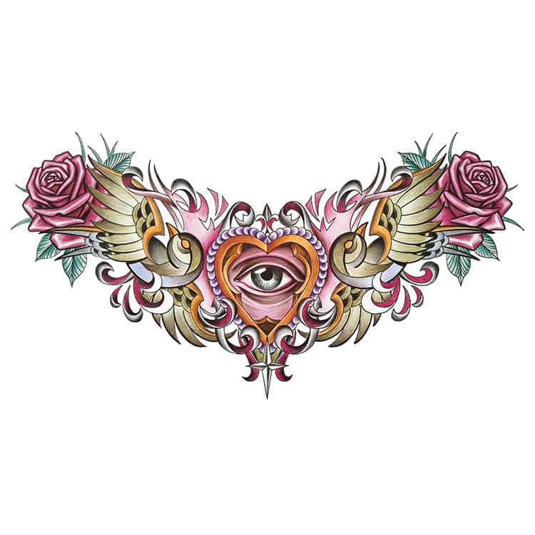 Heart of Vision is een opvallende tijdelijke tattoo van 32 x 19 cm, ontworpen voor vrouwen en bedoeld voor borst of rug. In het midden schittert een mysterieus oog in een hart, omgeven door vleugels, rozen en sierlijke lijnen. Deze tattoo blijft ongeveer 3 dagen zitten en maakt gegarandeerd indruk.