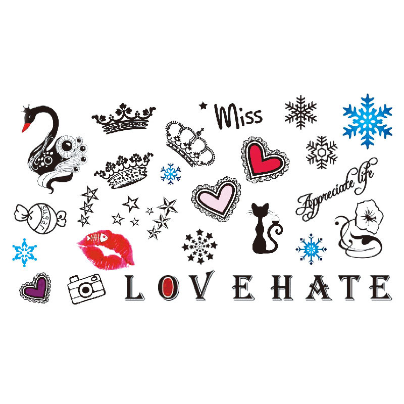 Love and Crowned Chaos is een vrolijk en rijk gevuld tijdelijk tattoo vel van 10,5 x 6 cm, boordevol mini tattoos met een vrouwelijke, speelse en lichte rebelsheid. Dit vel zit zó vol dat je bijna niet kunt kiezen: van fonkelende kroontjes tot romantische hartjes, van een elegant zwarte zwaan tot kleurrijke sneeuwvlokken, en van lieve katten tot een sierlijke “Appreciate life”-tekst. En dan die rode kusafdruk… die mag natuurlijk niet ontbreken.