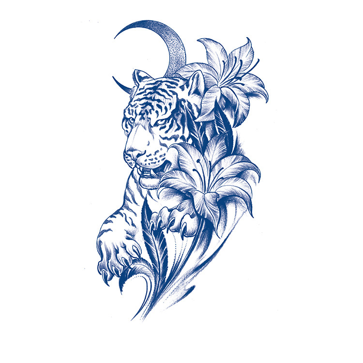 De tijger is wereldwijd bekend als symbool voor kracht, instinct en onafhankelijkheid. In veel culturen vertegenwoordigt hij moed, bescherming en koninklijk gezag. De toevoeging van de bloemen – die tederheid, bloei en schoonheid uitdrukken – geeft het geheel een zacht, harmonieus evenwicht. De halve maan daarboven versterkt het gevoel van mystiek, nachtrust en innerlijke wijsheid. Hierdoor is Lunar Jungle meer dan alleen een tattoo; het is een artistiek statement dat staat voor balans tussen kracht en rust.