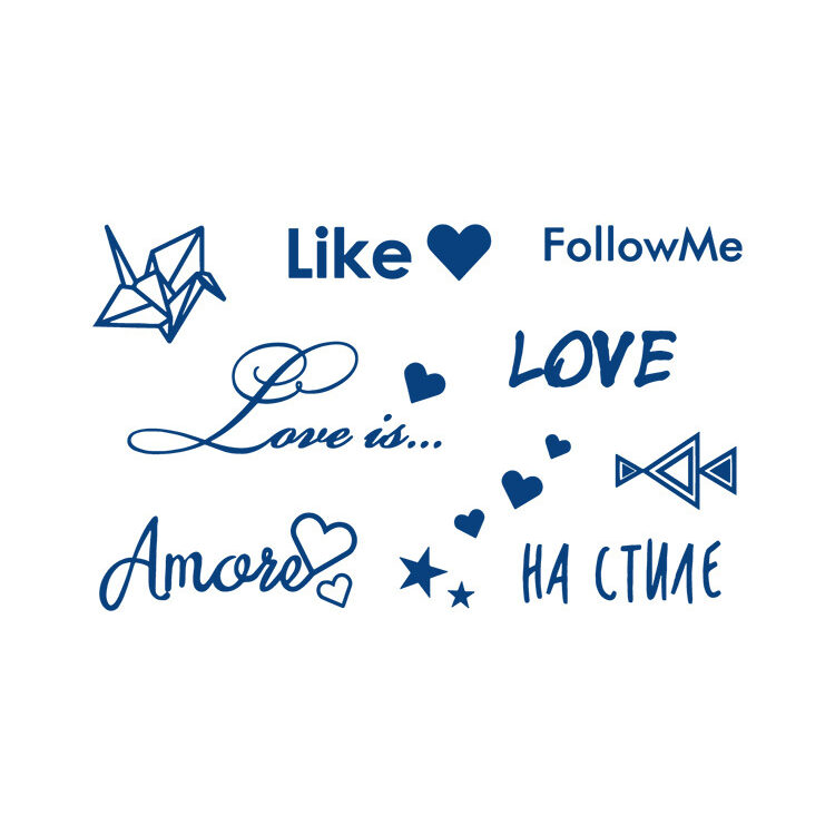 Mini Love and Style Set is een speelse en creatieve verzameling van mini tattoos, ideaal voor wie houdt van variatie en expressie. Dit 11 x 18 cm grote vel bevat meerdere kleine designs in een stijlvolle grijsblauwe kleur, perfect om te combineren of los te dragen. Denk aan woorden zoals Love, Amore, Like, Love is… en Follow Me — elk in hun eigen lettertype en karakter.