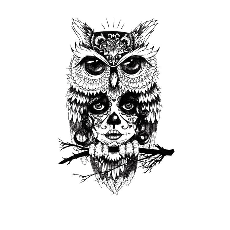 Owl Spirit Mask is een adembenemend ontwerp dat mysterie, symboliek en kunst samenbrengt. Op een tattoo vel van 12 x 19 cm zie je een krachtige uil, zittend op een tak, wiens verenkleed naadloos overgaat in het gezicht van een vrouw. Haar gezicht is beschilderd in de stijl van een Día de los Muertos-masker, met zwierige lijnen, bloemenmotieven en zwarte accenten rond ogen, neus en lippen. De ogen van de uil en de vrouw lijken in één blik samen te vallen, alsof ze samen waken over geheimen uit een andere wereld.