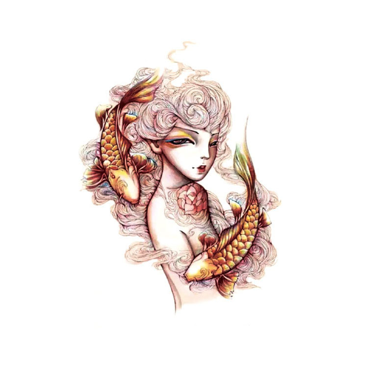 Pisces Dreamer is een kunstzinnige tijdelijke tattoo die het sterrenbeeld Vissen op sierlijke en symbolische wijze tot leven brengt. In het midden staat een verfijnde vrouw met een dromerige blik en zacht golvend haar dat in sierlijke patronen rondom haar hoofd beweegt. Aan weerszijden zwemmen twee gouden vissen, verweven met haar haarlokken en omringd door subtiele waterstromen en bloemmotieven.