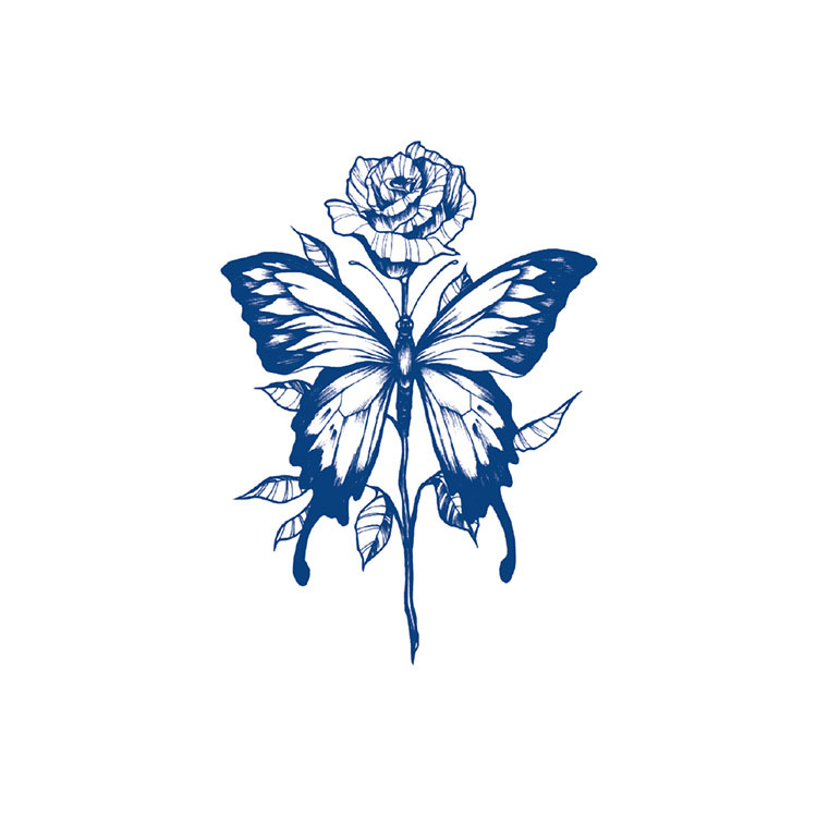 Rosewing is een verfijnde 2 weken tattoo van 7 x 12 cm waarin een vlinder en een roos één zijn geworden. De vleugels vormen samen een bloem in volle bloei, uitgevoerd in een subtiele grijsblauwe tint die bijna niet van echt te onderscheiden is. Elegant, dromerig en vol symboliek: transformatie en liefde in één ontwerp.