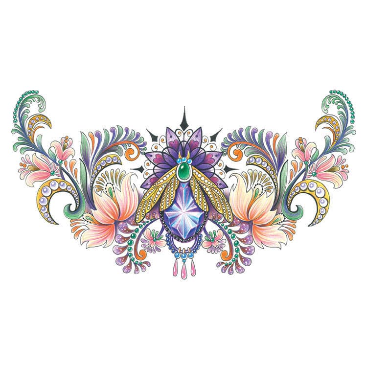 Royal Jewel is een tijdelijke tattoo die klasse en fantasie combineert in één weelderig ontwerp. Het 12 x 19 cm grote vel toont een symmetrisch kunstwerk waarin een fonkelend edelsteenmotief centraal staat. Dit juweel, schitterend in tinten van paars en blauw, lijkt te gloeien en wordt omlijst door bloemblaadjes, kleurrijke ornamenten en barokke krullen.