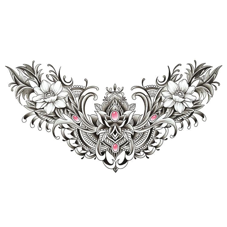 Het zwart-wit lijnenspel wordt versterkt door subtiele roze edelsteentjes die over de hele compositie zijn verdeeld. Deze details geven het geheel een zachte, vrouwelijke kracht en maken de tattoo visueel rijk zonder te overheersen. De twee grote bloemen links en rechts versterken de symmetrie en zorgen voor een uitgebalanceerd totaalbeeld dat prachtig aansluit op de natuurlijke lijnen van het lichaam.