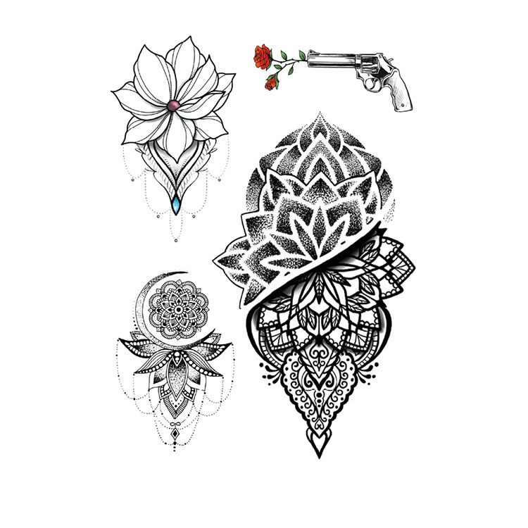 Sacred Bloom Rebellion is een tijdelijke tattoo vol karakter. Deze set bevat spirituele mandala’s, bloemen met edelsteenaccenten, een halve maan vol details én een revolver met een roos in de loop – een krachtig symbool voor vrede en innerlijke kracht.