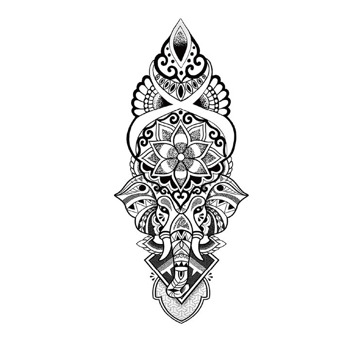 Sacred Elephant is een tijdelijke tattoo van 11,4 x 21 cm die traditie, spiritualiteit en symmetrie op een unieke manier combineert. Deze 3 dagen tattoo is opgebouwd rondom het beeld van een majestueuze olifant, omringd door mandala-elementen en geometrische vormen die samen zorgen voor een perfecte visuele balans.
