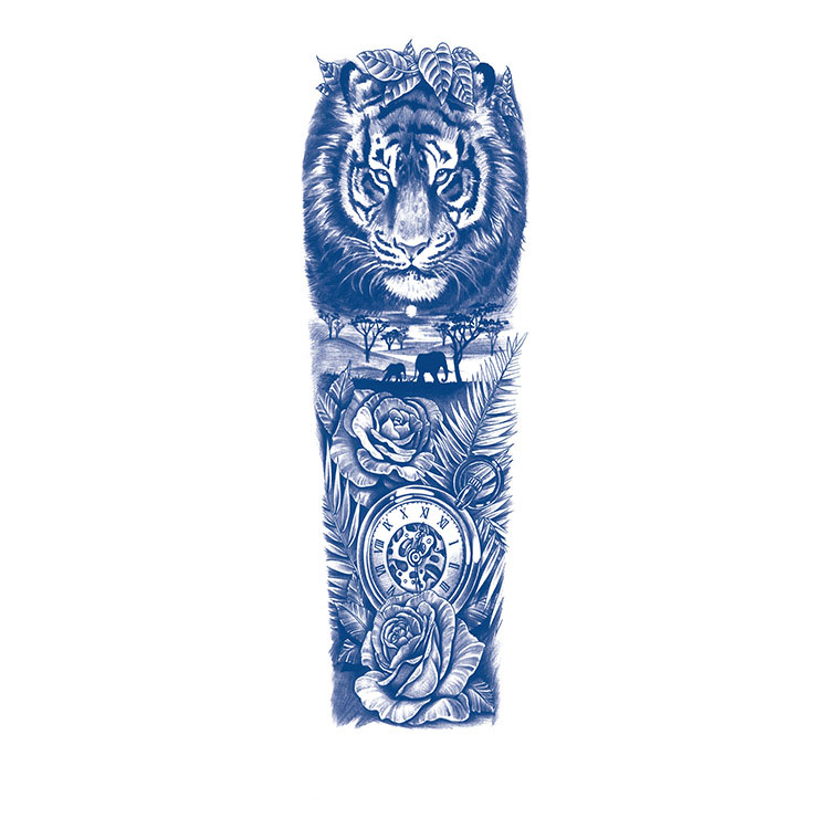 Savannah Spirit is een levensechte tijdelijke tattoo met een intense tijger, Afrikaanse savanne, olifanten en rozen. Een klassieke klok met Romeinse cijfers symboliseert tijd en vergankelijkheid. Deze indrukwekkende compositie straalt kracht, mystiek en natuurverbondenheid uit. Perfect voor liefhebbers van wildlife, symboliek en realistische tattoo art.