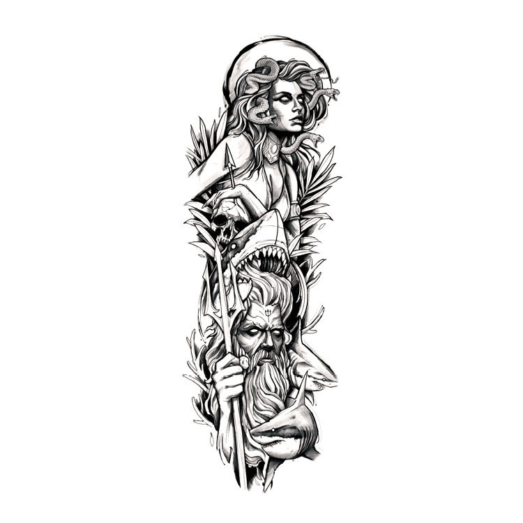 Sea of Legends is een spectaculaire 3 dagen tattoo sleeve van 48 x 17 cm. Dit zwart-witte meesterwerk toont Poseidon met zijn drietand, een woeste haai, een mysterieuze vrouw met Medusa-achtige slangenharen en een oceaan vol mythische kracht. Een statement piece dat de kracht en mysterie van de zee ademt.
