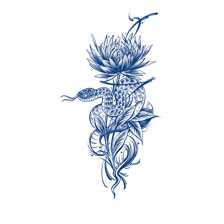Flower Snake is een mysterieuze en verfijnde tijdelijke tattoo die de elegantie van de natuur combineert met een symbolisch randje. In dit ontwerp zie je een sierlijk gevormde slang die zich om een majestueuze lotusbloem slingert. Het lijnenspel is krachtig maar zacht, met aandacht voor detail in elk blad, elke schub en elke bocht. De tattoo straalt balans uit tussen dreiging en schoonheid, en dat maakt het een echte blikvanger.