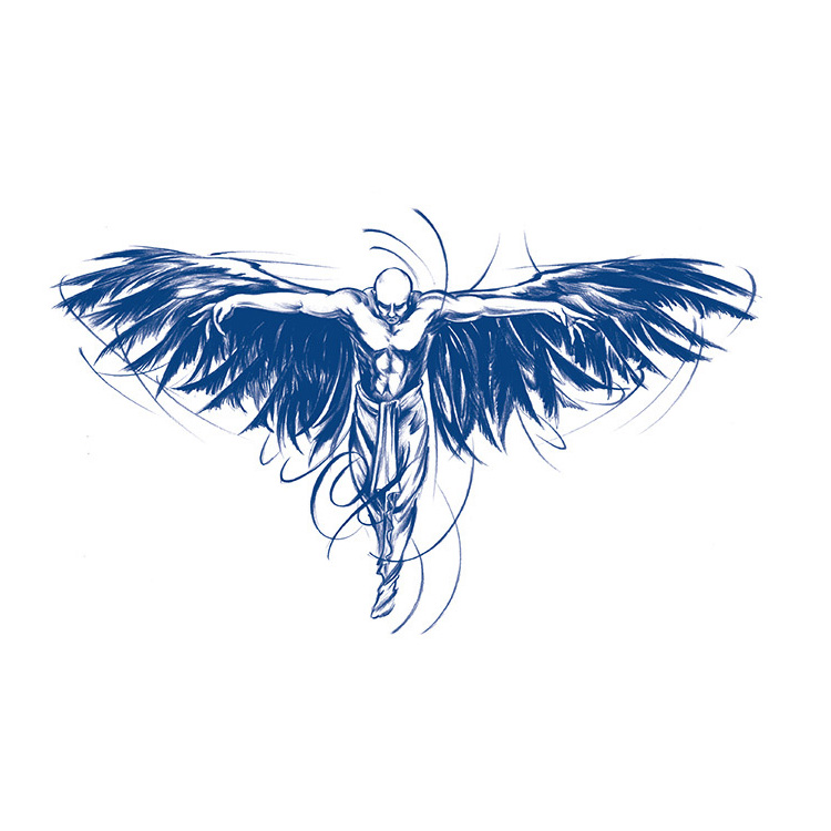 Het ontwerp is rijk aan symboliek. De donkere vleugels kunnen staan voor schaduwzijden, bescherming of juist kracht die voortkomt uit het overwinnen van innerlijke strijd. Zijn kale hoofd en gespierde lichaam benadrukken de puurheid en rauwe energie van deze figuur. De sierlijke, golvende lijnen rond zijn lichaam geven het geheel een bijna goddelijke uitstraling.