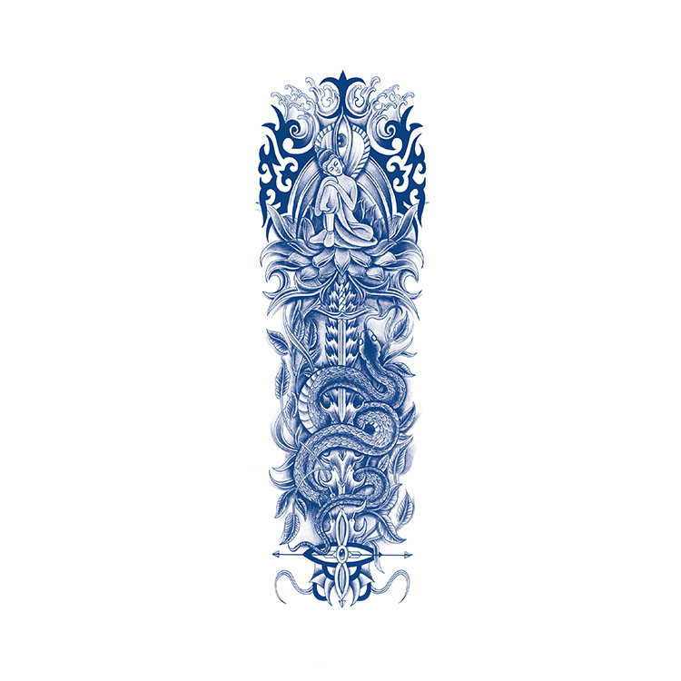 Deze indrukwekkende tijdelijke tattoo ‘Silent Guardian’ straalt kracht, bescherming en spirituele rust uit. Bovenaan zien we een vredige Boeddhafiguur, zittend in meditatie op een prachtige, opengewerkte lotusbloem – hét symbool van zuiverheid, verlichting en spirituele groei. De Boeddha bevindt zich in een harmonieuze houding, met gesloten ogen en een ontspannen uitstraling die direct kalmte overbrengt.
