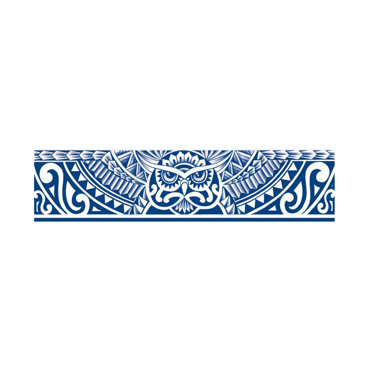 Dankzij het strakke lijnenspel en de subtiele schaduwwerking krijgt het ontwerp diepte en levendigheid, waardoor het op de huid echt tot leven komt. De diepe blauwe kleur versterkt het contrast met de huid en geeft het geheel een moderne en frisse uitstraling. Door zijn vorm is deze tattoo uitermate geschikt als armband, maar hij doet het ook goed op het onderbeen of zelfs rond de kuit.
