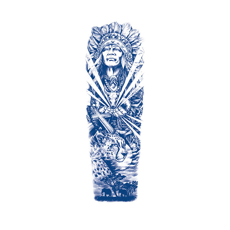 Spirit of the Ancients is een tijdelijke tattoo die voelt als een spirituele reis in inkt. Bovenaan straalt een inheemse leider met een indrukwekkende verenkroon. Zijn gelaatsuitdrukking is krachtig maar kalm — als een sjamaan, een beschermer, een gids. Vanuit zijn handen verspreiden zich stralen van energie, alsof hij wijsheid en levenskracht uitzendt.