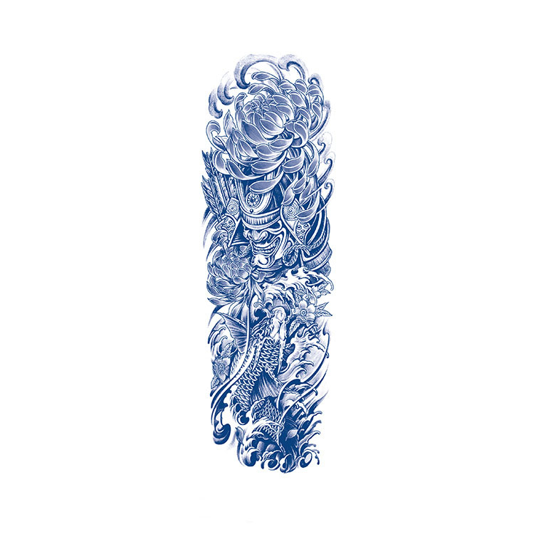 Deze tijdelijke tattoo sleeve straalt kracht en eer uit. Een imposant samurai-masker, gecombineerd met sierlijke bloemen en dynamisch golvend water, vormt een indrukwekkend geheel. Ideaal voor wie spiritualiteit en kracht wil uitdrukken met een ontwerp dat tot wel twee weken zichtbaar blijft. Tijdelijk, maar met blijvende impact.