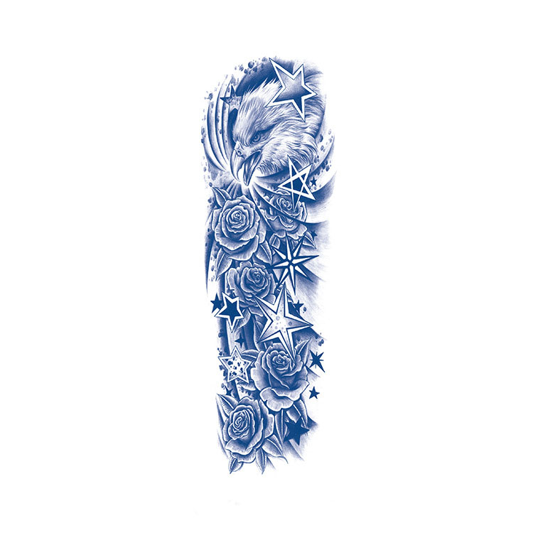 Starborn Spirit is een indrukwekkende tijdelijke tattoo sleeve die symbool staat voor vrijheid, visie en kracht. In het midden prijkt een gedetailleerde adelaarskop, het ultieme symbool van scherpzinnigheid, zelfvertrouwen en onafhankelijkheid. De adelaar wordt omringd door prachtige rozen, die staan voor liefde, schoonheid en kwetsbaarheid. Daartussen schitteren sterren in verschillende formaten — als teken van hoop, richting en innerlijk licht.