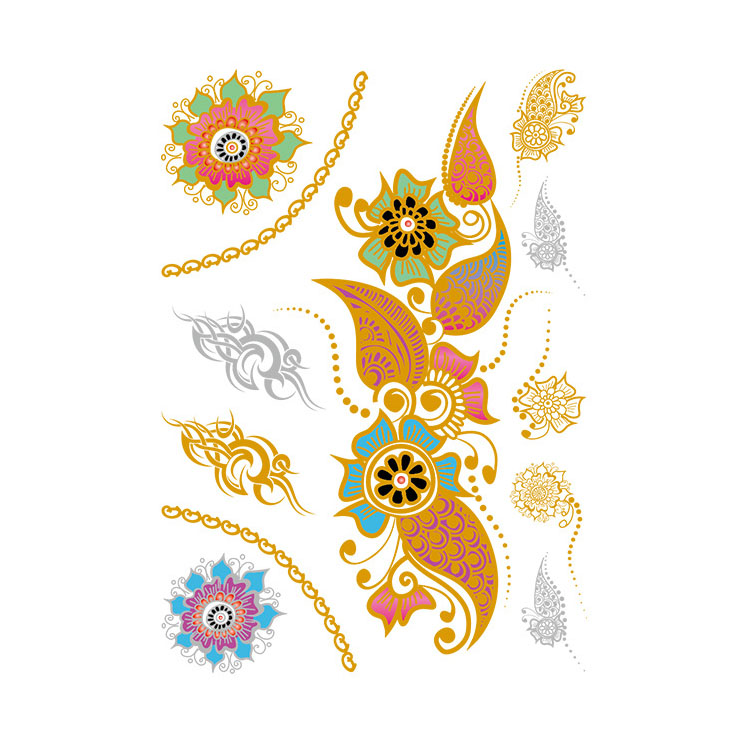 Sunset Bloom is een stijlvolle tijdelijke tattoo die oosterse elegantie en boho-vibes perfect combineert. Dit tattoo vel van 14,8 x 21 cm bevat een prachtig geheel van sierbloemen, paisley-figuren en tribale elementen in glanzend goud, gecombineerd met levendig roze, turquoise, zwart en zilver. De fijne details en zachte metallic glans geven de tattoo een luxueuze uitstraling die perfect past bij een vrije, creatieve levensstijl.
