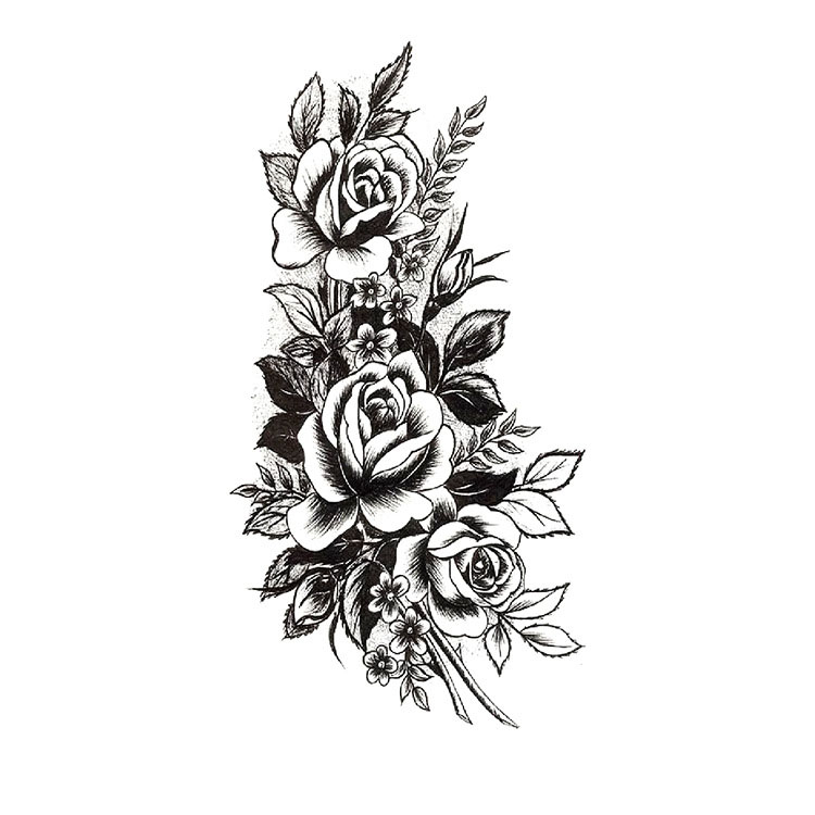 Timeless Roses is een verfijnde tijdelijke tattoo die direct de aandacht trekt door zijn elegante zwart-witte lijnenspel. Met een formaat van 11,4 x 21 cm is deze 3 dagen tattoo perfect geschikt voor een mooie plek op je lichaam zoals de bovenarm, dij of langs de ribbenkast. De compositie bestaat uit meerdere grote rozen, omringd door kleinere bloemen en bladstructuren, met prachtige contrasten en schaduwen.