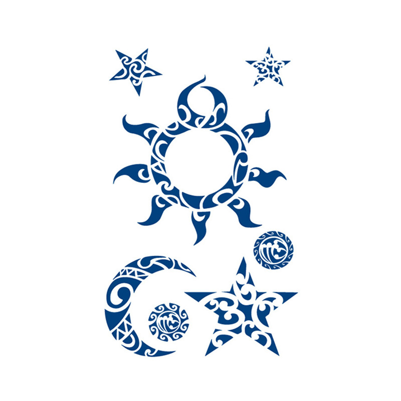 Tribal Cosmos is een intrigerende 2-weken tattoo die zon, maan en sterren samenbrengt in een stijlvol tribaal ontwerp. Deze set bestaat uit meerdere losse tattoos, allemaal uitgevoerd in een diepe blauwgrijze kleur die lijkt op echte inkt – alsof ze al jaren op je huid zitten.