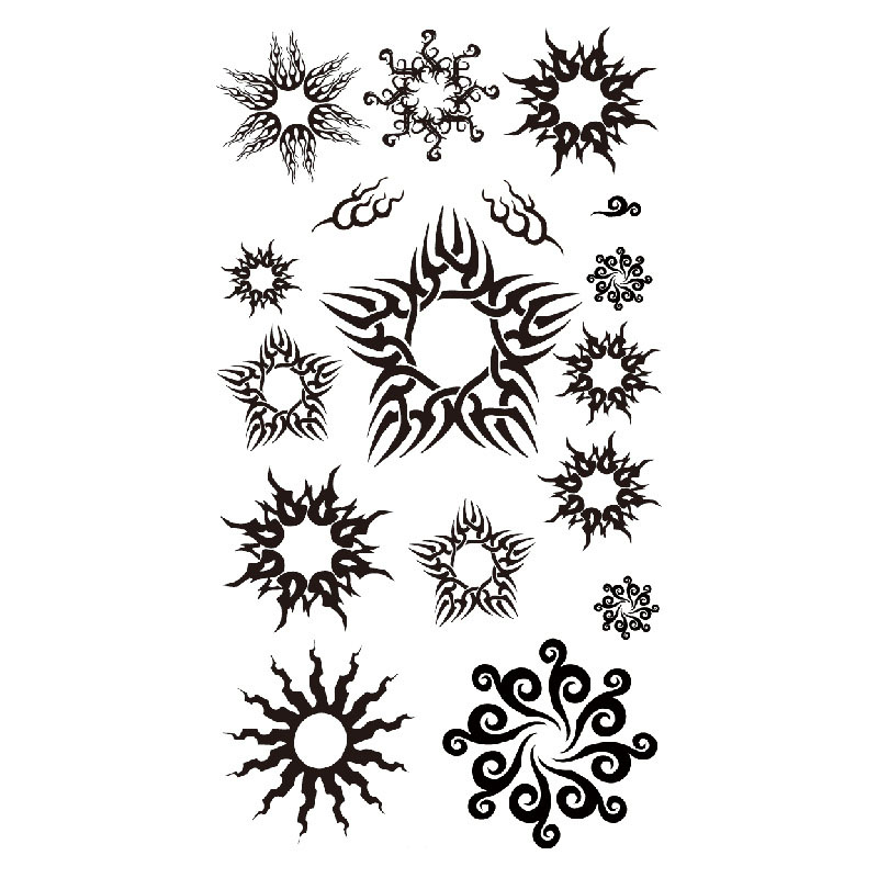 Tribal Sunstorm is een 3 dagen tattoo op een vel van 10,5 x 6 cm, boordevol vijftien krachtige mini zon-symbolen in tribal stijl. Vurig, energiek en creatief inzetbaar. Draag ze los of combineer ze tot jouw eigen zonnesysteem. Stoer op arm, nek of schouder — perfect voor liefhebbers van kleine, opvallende tattoos.