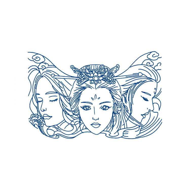 Trinity of Grace is een betoverende tijdelijke tattoo waarin drie vrouwelijke gezichten samenkomen in een symmetrisch en sierlijk ontwerp. In de grijsblauwe lijnstijl zie je een godin-achtig figuur in het midden met een kroon vol detail, geflankeerd door twee serene gezichten aan weerszijden. Hun gesloten ogen stralen rust uit, alsof ze zich bevinden in een meditatieve staat van innerlijke balans.